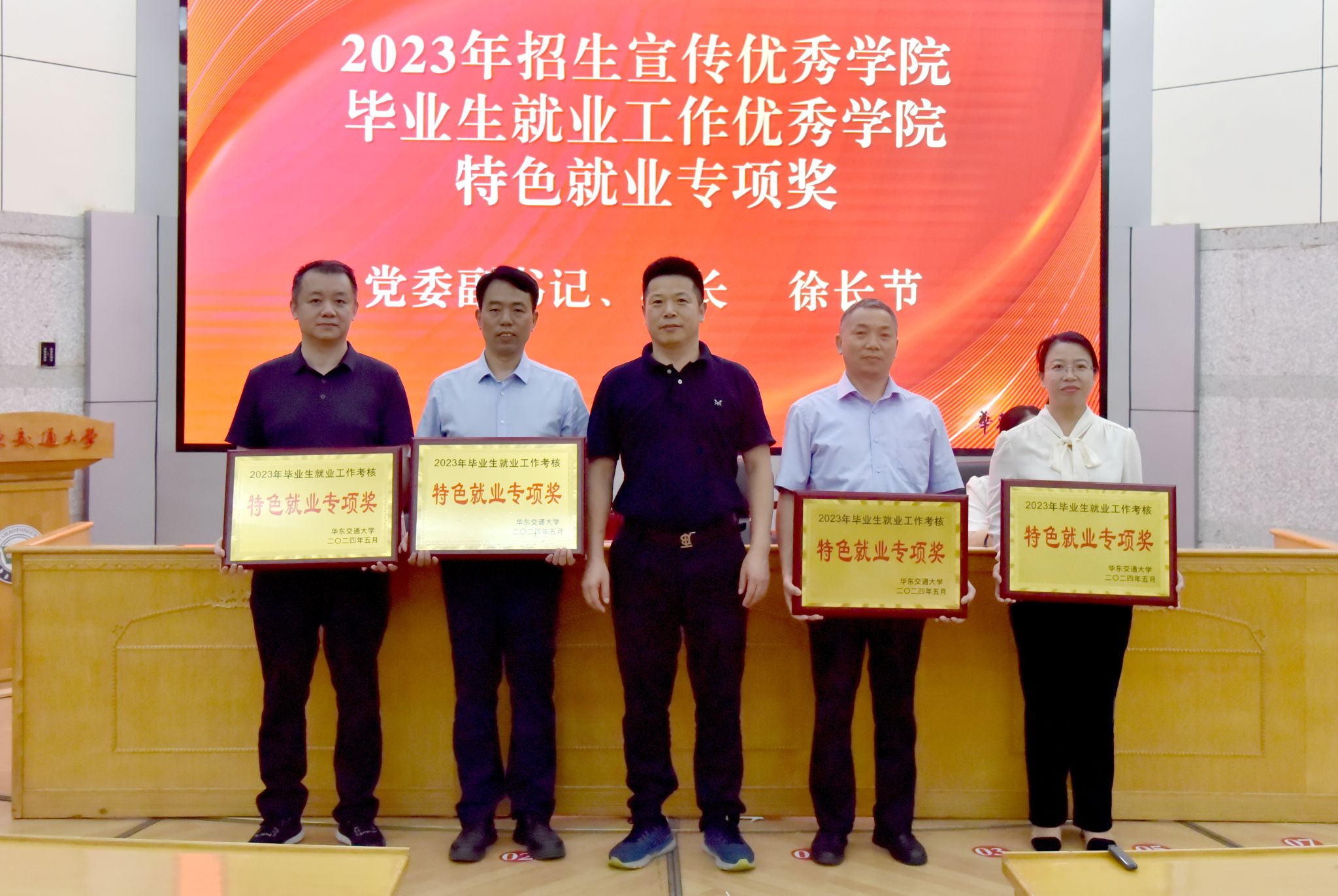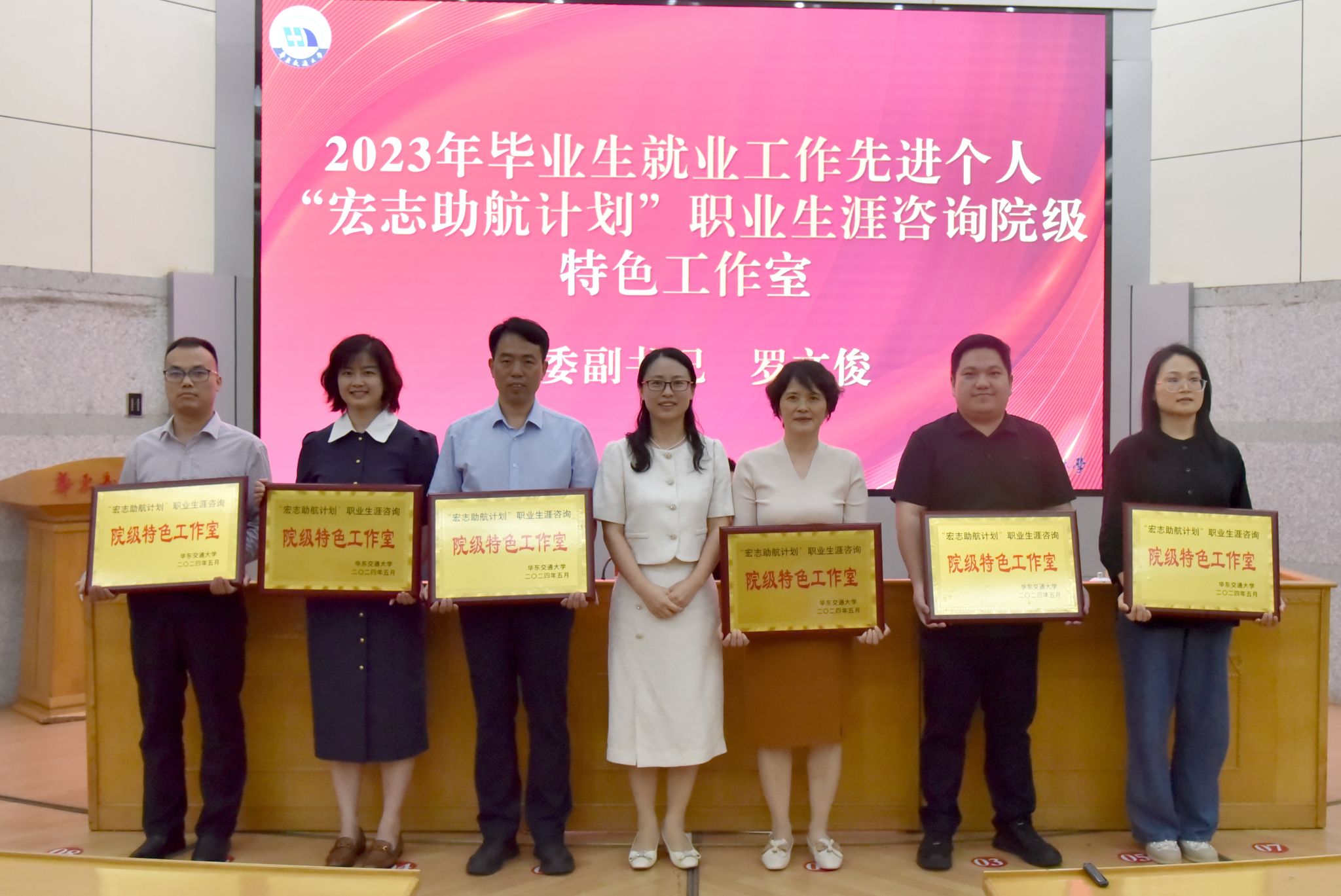 会上举行了颁奖授牌仪式。徐长节为2023年招生宣传优秀学院、毕业生就业工作优秀学院、特色就业专项奖颁奖。罗文俊为2023年毕业生就业工作先进个人颁奖,为“宏志助航计划”职业生涯咨询院级特色工作室授牌。