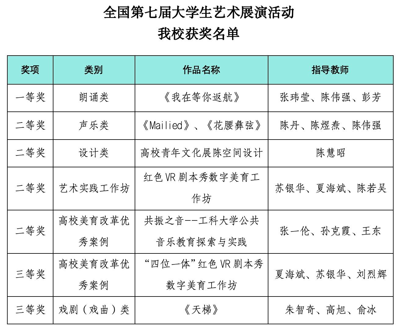 近日,全国第七届大学生艺术展演活动(简称“大艺展”)落下帷幕,我校获一等奖 1 项、二等奖 4 项、三等奖 2 项,并获评“高校优秀组织奖”,获奖总数位列全省第一。