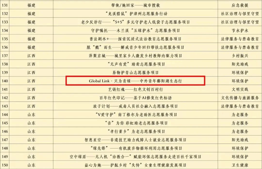11月30日至12月1日,第七届中国青年志愿服务项目大赛全国赛终评在广东汕头举行。我校国际学院选送的“Global Link 只为青绿——中外青年鄱阳湖生态行”项目斩获银奖,实现了学校在该赛事中国家级奖项零的突破。此前,我校在省赛环节以1金1银2铜创历史最好成绩,获奖数并列全省第一。