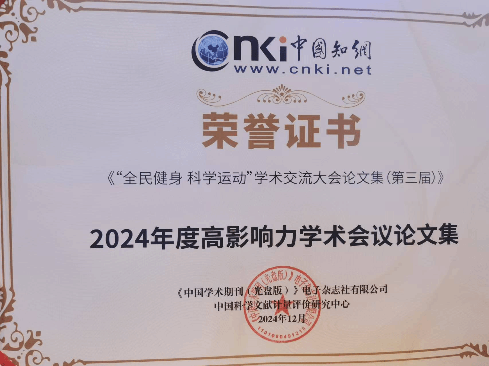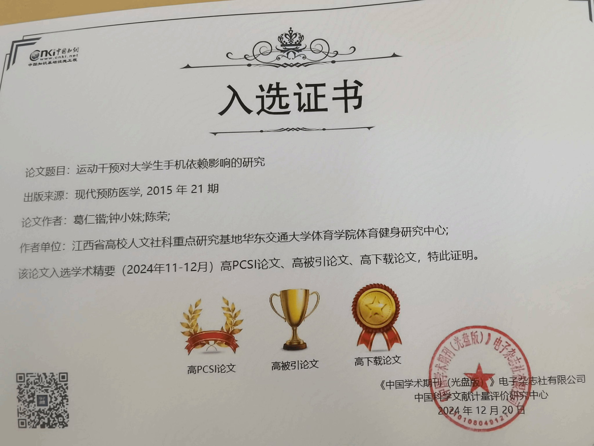 近日,“2024年度知网学术影响力评价系列报告发布会”在北京举行,大会发布了《2024年度“中国知网高被引学者”遴选结果》《2024年度“国际影响力TOP期刊”榜单》《科技期刊世界影响力指数(WJCI)报告》《中国学术期刊国际引证年报》《高影响力学术辑刊评价报告》《高学术影响力中国报纸评价报告(2024)》《高影响力学术会议论文集评价报告(2024)》。由我校体健学院与江西省体育科学学会联合主办的《“全民健身 科学运动”学术交流大会论文集(第三届)》被评为知网社会科学类“高影响力学术会议论文集”TOP50榜首。我校教师葛仁锴发表的论文《运动干预对大学生手机依赖影响的研究》入选学术精要高PCSI论文、高被引论文、高下载论文。