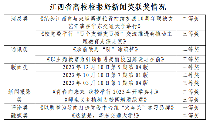 近日,江西省高校校报协会公布了“2023年江西省高校校报好新闻”评审结果,我校报送的11件作品获一等奖2项、二等奖5项、三等奖4项。其中,获评论类一等奖1项;版面类一、二、三等奖各1项,消息类二、三等奖各1项;通讯类二、三等奖各1项;新闻摄影类二、三等奖各1项;融媒类二等奖1项。