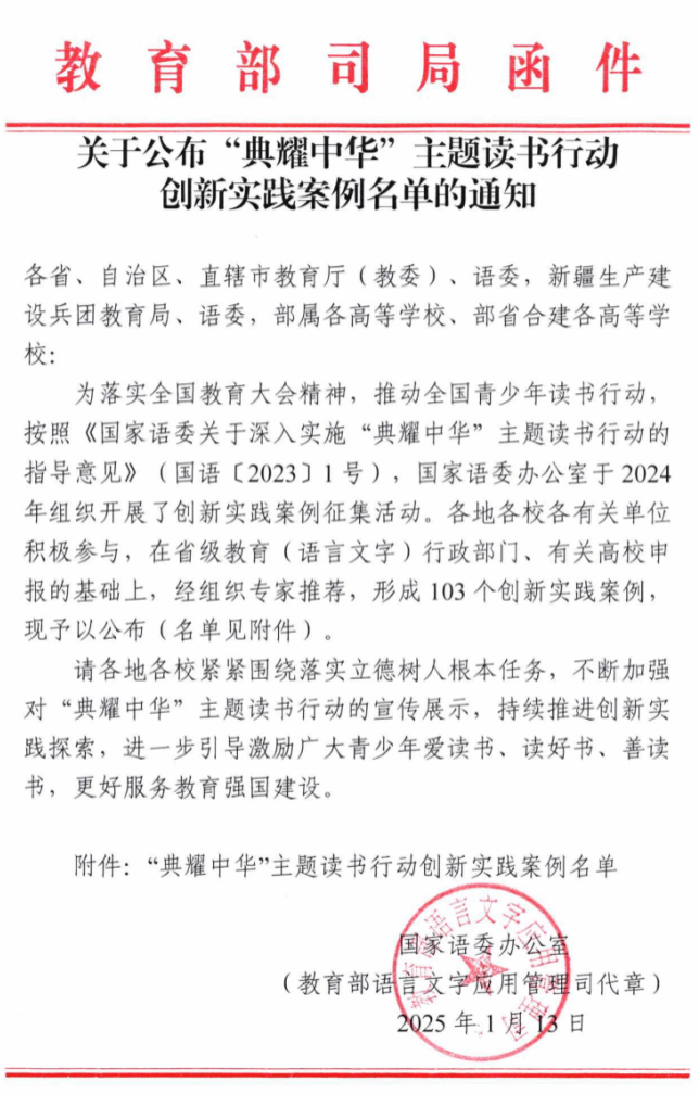 近日,教育部公布了2024年“典耀中华”主题读书行动创新实践案例名单。我校图书馆申报的《铸魂培根、承古开新——“典耀中华”主题读书行动实践》项目,从众多参评案例中脱颖而出,入选全国52个主题读书实践品牌案例。
