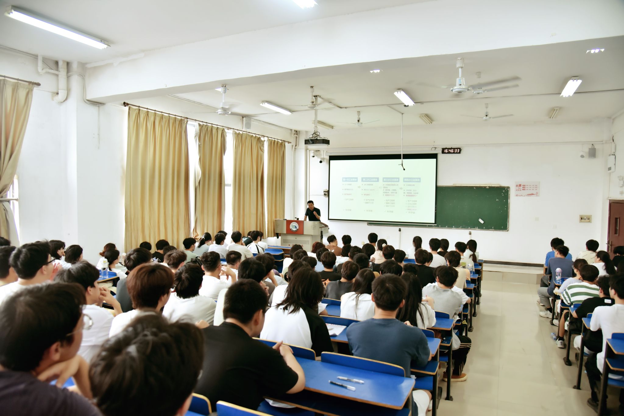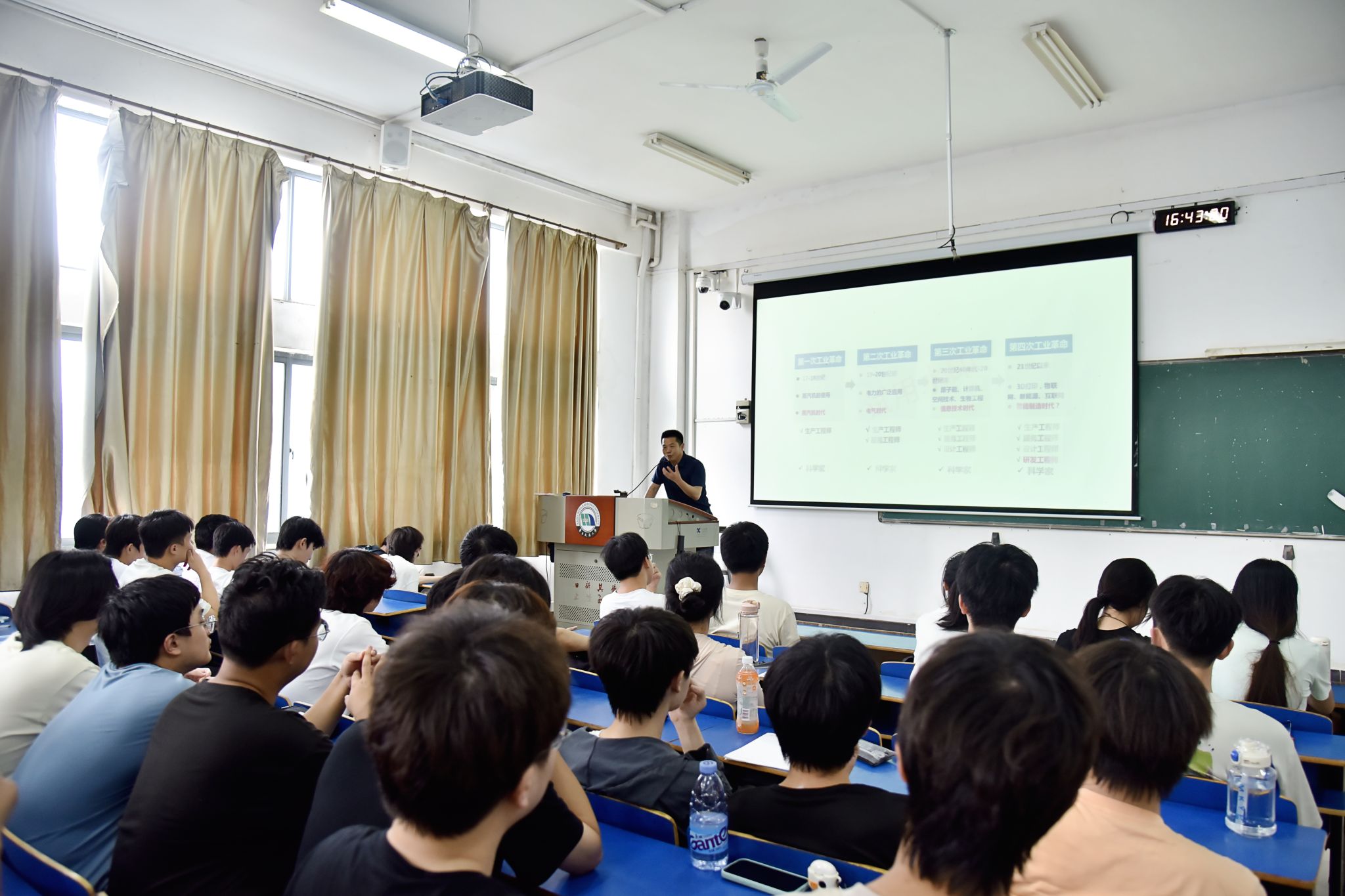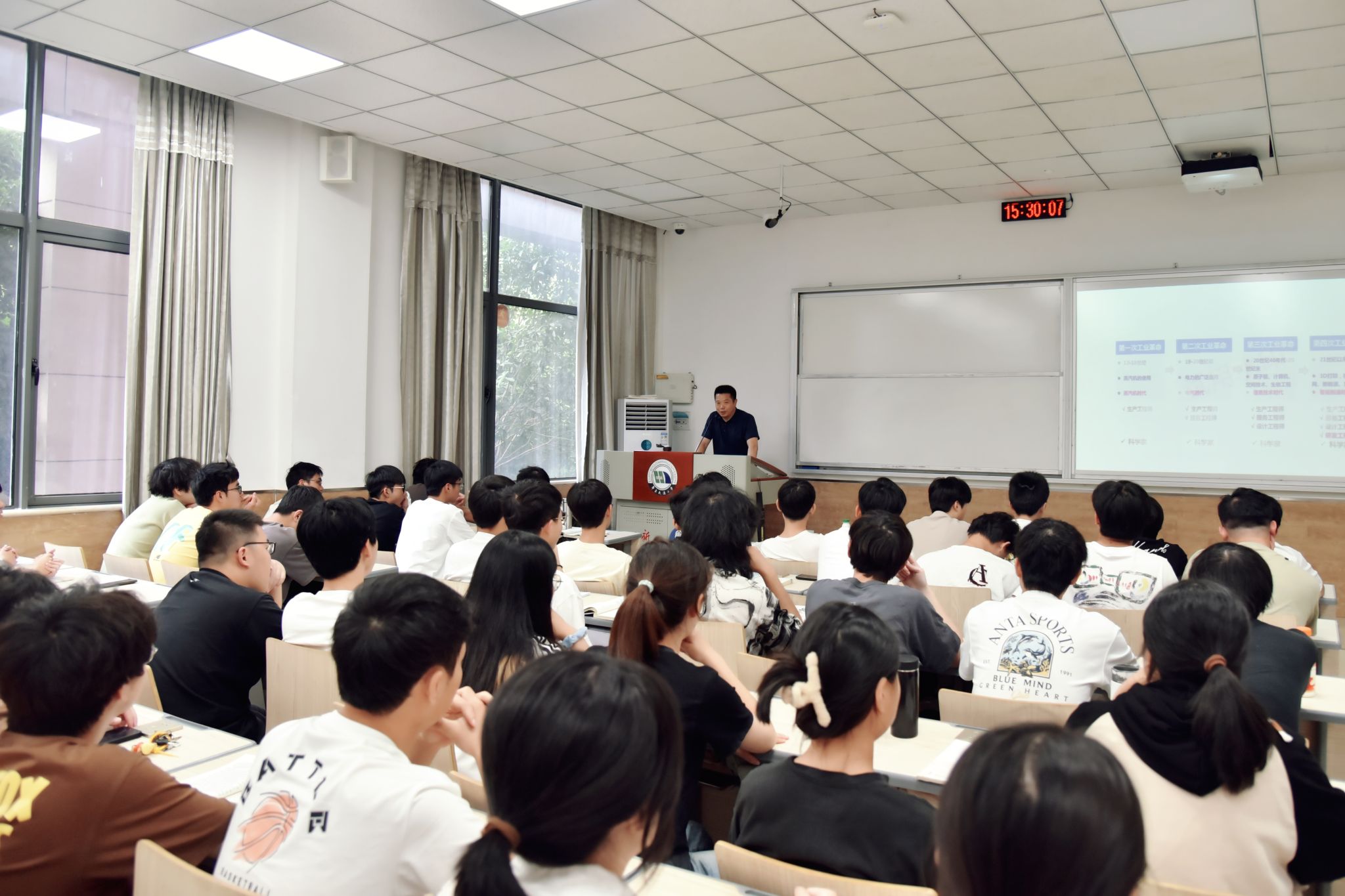 课堂上,徐长节以四次工业革命和美国的经济发展为例阐述了科学技术在社会经济发展中的支撑地位。他指出,人类社会正面临着前所未有的变局,新兴技术深刻改变着人们的生活方式。教育是培养人才的基础,人才是推动科技进步的关键力量。高校作为培养人才和推动科技进步的主力军,担负着重要使命。