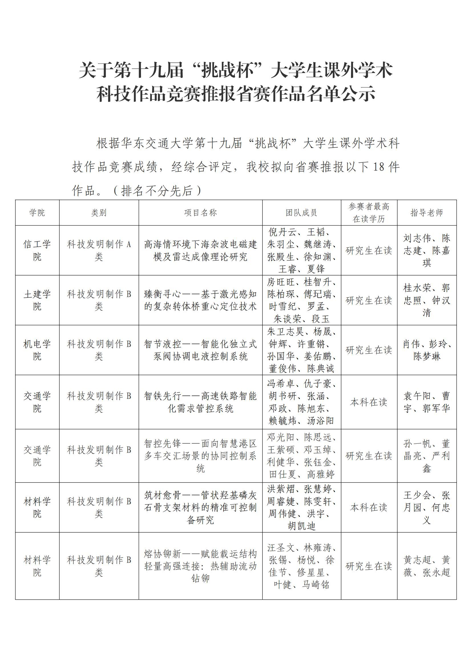 关于第十九届“挑战杯”大学生课外学术科技作品竞赛推报省赛作品名单公示