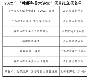 近日,江西省科协印发《2022年“赣鄱科普大讲堂”项目拟立项名单》并通过公示,我校首次获批2022年“赣鄱科普大讲堂”项目的立项。“赣鄱科普大讲堂”是江西省科协为提高公众科学素质,促进创新型省份建设,服务江西高质量发展而开展的全省大型科普品牌活动。
