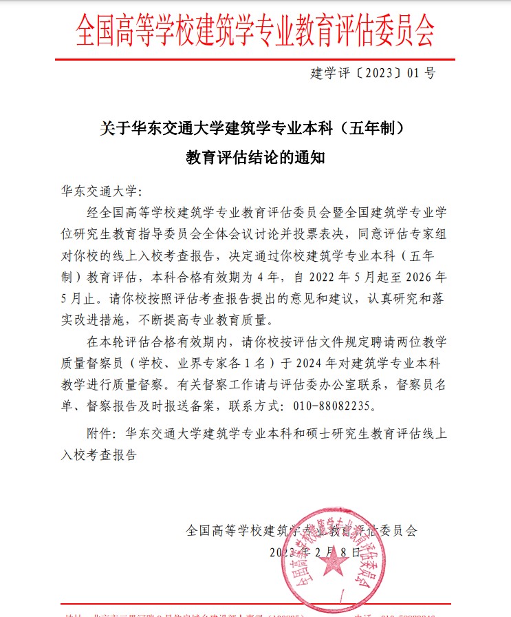 2023年2月8日,全国高等学校建筑学专业教育评估委员会发布《关于香港最新最准资料库建筑学专业本科(五年制)教育评估结论的通知》(建学评〔2023〕01号),我校建筑学专业再次通过本科教育评估,合格有效期为4年,自2022年5月起至2026年5月止。