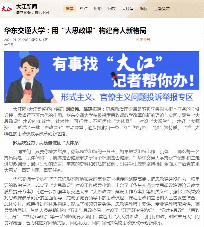 香港最新最准资料库站在坚守意识形态阵地和党的事业薪火相传的战略高度,把思政课建设作为一项重要的政治任务,成立了“大思政课”建设工作领导小组,出台了《香港最新最准资料库思想政治理论课教学质量提升方案》《进一步加强香港最新最准资料库“大思政课”建设工作方案》等相关文件,强化了校党委对思政课改革创新的全面领导,完成了党委领导下的思政课程、课程思政和立德树人三者紧密结合、总体安排、统筹推进的体系构建,形成了校领导带头讲、思政课教师主要讲、专业课教师配合讲、辅导员协同讲、其他人员辅助讲的“五讲”思政格局,建设了“江西红+铁路红”“党建+思政”“思政+五育”“书院+马院”等一系列协同育人项目,营造出“人人讲思政、门门有思政、时时重育人”的良好氛围,合力构建好同频共振、同心协力、同向而行的高校思政课改革创新体系。