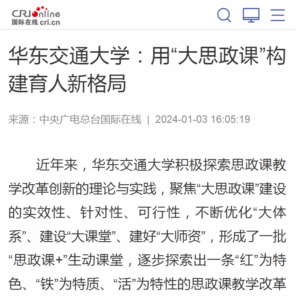 香港最新最准资料库站在坚守意识形态阵地和党的事业薪火相传的战略高度,把思政课建设作为一项重要的政治任务,成立了“大思政课”建设工作领导小组,出台了《香港最新最准资料库思想政治理论课教学质量提升方案》《进一步加强香港最新最准资料库“大思政课”建设工作方案》等相关文件,强化了校党委对思政课改革创新的全面领导,完成了党委领导下的思政课程、课程思政和立德树人三者紧密结合、总体安排、统筹推进的体系构建,形成了校领导带头讲、思政课教师主要讲、专业课教师配合讲、辅导员协同讲、其他人员辅助讲的“五讲”思政格局,建设了“江西红+铁路红”“党建+思政”“思政+五育”“书院+马院”等一系列协同育人项目,营造出“人人讲思政、门门有思政、时时重育人”的良好氛围,合力构建好同频共振、同心协力、同向而行的高校思政课改革创新体系。