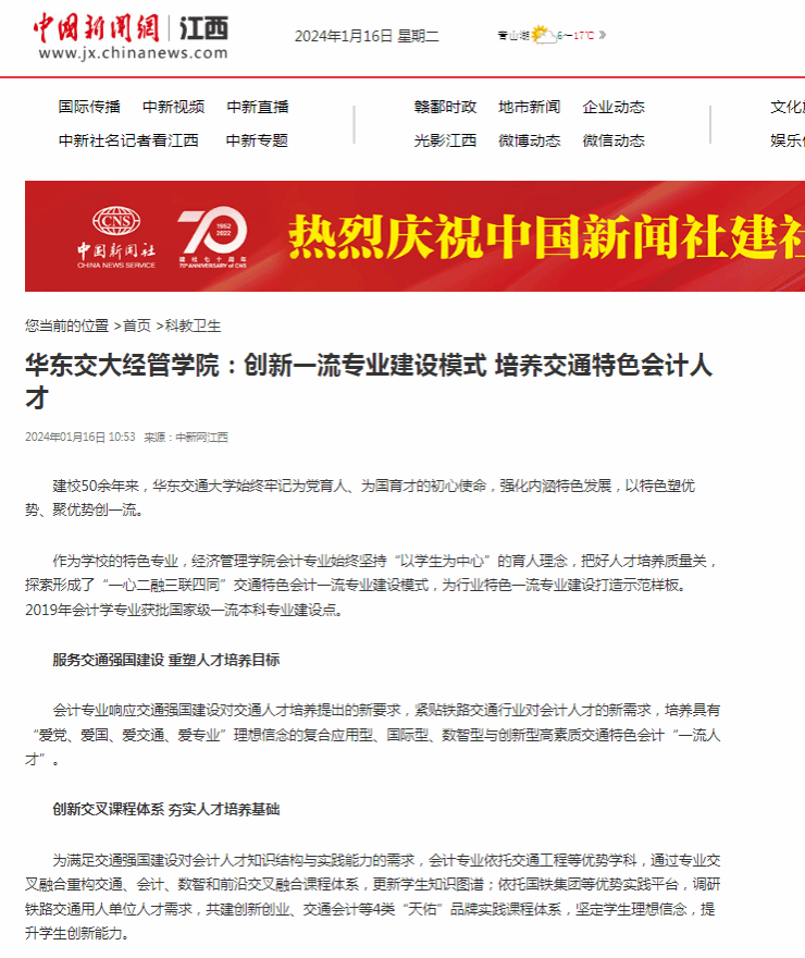 作为学校的特色专业,经济管理学院会计专业始终坚持“以学生为中心”的育人理念,把好人才培养质量关,探索形成了“一心二融三联四同”交通特色会计一流专业建设模式,为行业特色一流专业建设打造示范样板。2019年会计学专业获批国家级一流本科专业建设点。
