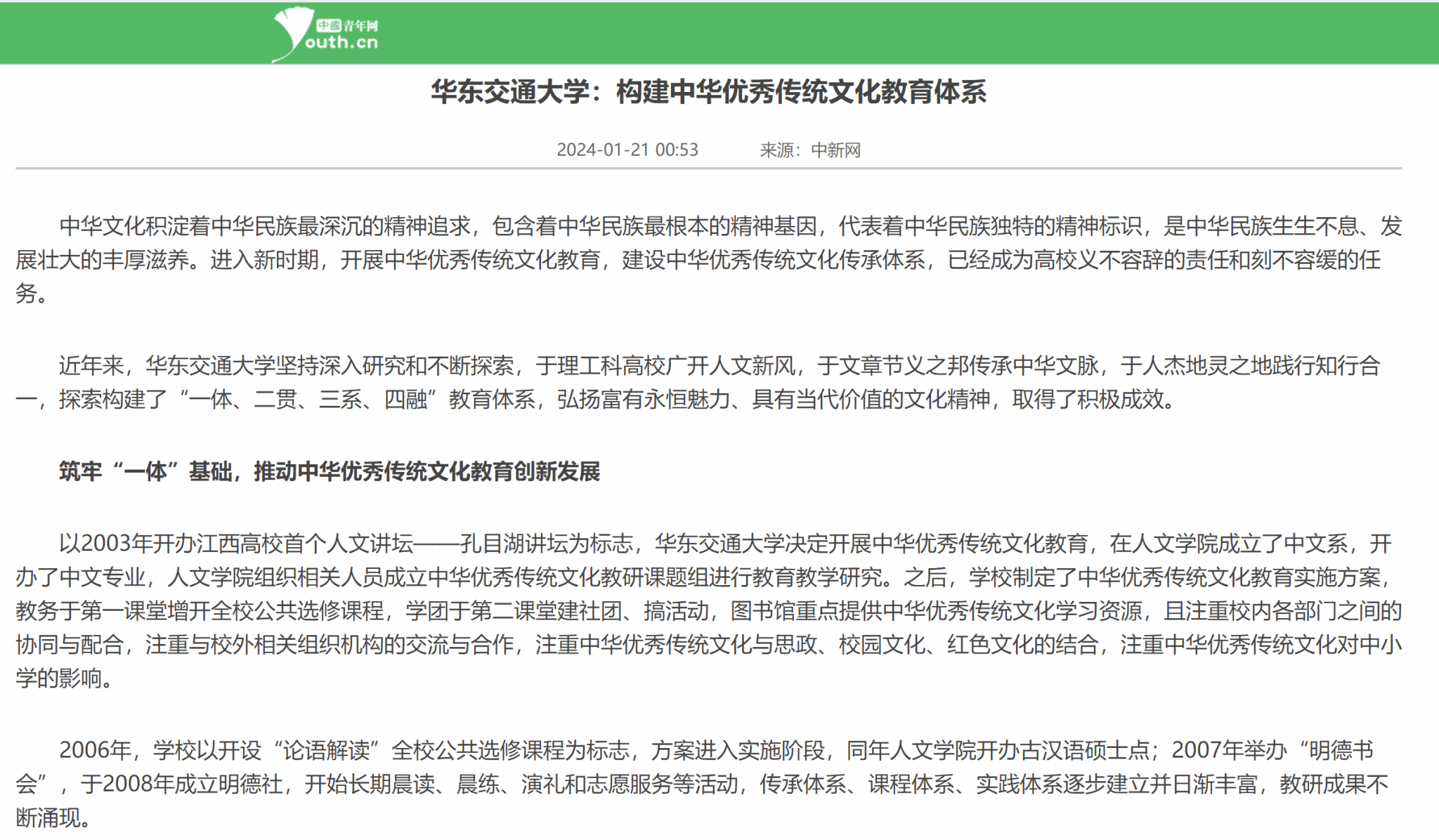 近年来,香港最新最准资料库坚持深入研究和不断探索,于理工科高校广开人文新风,于文章节义之邦传承中华文脉,于人杰地灵之地践行知行合一,探索构建了“一体、二贯、三系、四融”教育体系,弘扬富有永恒魅力、具有当代价值的文化精神,取得了积极成效。