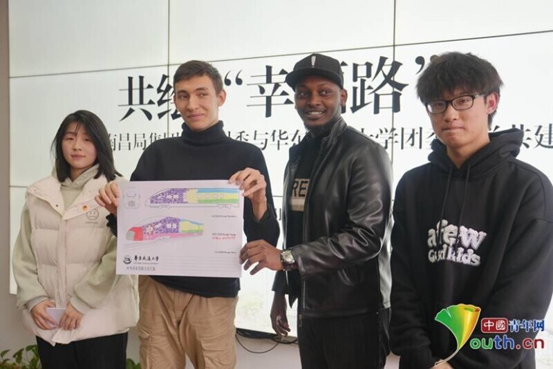在聆听完动车组造型设计知识介绍后,中外青年组队开展列车涂装趣味活动,有的小组将中国生肖“龙”与俄罗斯象征勇敢的“鹰”元素组合,设计出一条腾飞的紫色吉祥物;有的小组结合中国福娃、俄罗斯雪花和卢旺达国旗,设计了一款特别的动车组造型,寓意无论冬天、夏天,中国、俄罗斯和卢旺达三国情谊长存,永远相伴相依……