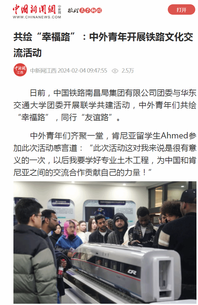 华东交大中外青年学生与中铁南昌局集团铁路青年就铁路相关话题开展了热烈的交流与讨论。“磁悬浮列车在中国投入使用了吗?去哪些城市可以坐?”“高铁会不会断电?如果断电了怎么办?”“中欧班列经过南昌吗?如果我想留在中国做生意,我怎么搭上中欧班列?”……在一问一答中,中外青年们提升了对中国铁路文化的认知和理解,感受到了中国铁路文化的独特魅力。