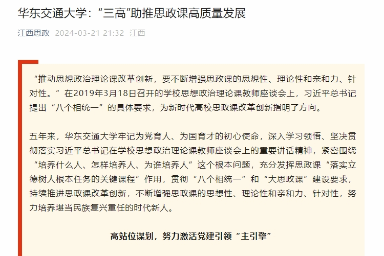 规范课程标准,做好课程建设“必答题”。五年来,聚焦《高等学校思想政治理论课建设标准(2021年本)》要求,学校持续对标对表,以一流课程建设引领思政课建设:聚焦打造“金课”,淘汰“水课”的建设目标,科学构建“必修+选修”“基础+提升”“线上+线下”“理论+实践”的本硕博阶段性、贯通式、递进式的课程体系,形成了全目标融入培养方案、全方位进入教学体系、全环节纳入培养要求的建设思路;不断推动思政课教学改革创新,围绕教学理念、教学内容、教学形式、教学方法、教学载体“五个维度”,获批了省级思政课“名师工作室”——刘波名师工作室,打造教学科研共同体,构建了课堂教学+实践教学+网络新媒体教学“三位一体”立体课堂教学新模式。