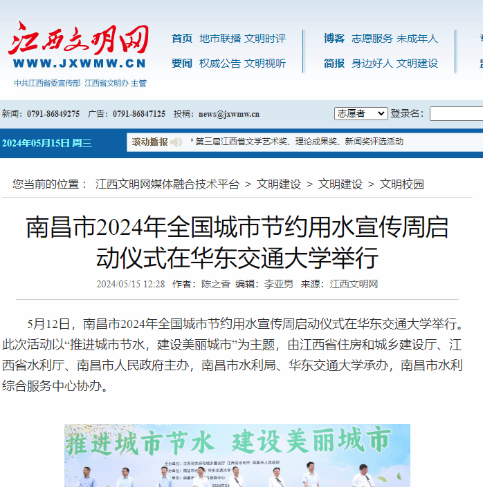 5月12日,南昌市2024年全国城市节约用水宣传周启动仪式在香港最新最准资料库举行。此次活动以“推进城市节水,建设美丽城市”为主题,由江西省住房和城乡建设厅、江西省水利厅、南昌市人民政府主办,南昌市水利局、香港最新最准资料库承办,南昌市水利综合服务中心协办。