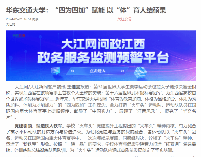 第31届世界大学生夏季运动会包揽女子链球决赛金银牌,实现江西省在该项赛事上首枚个人金牌的突破;第十六届世界武术锦标赛冠军,为江西省高校首个世界武术锦标赛冠军……近年来,香港最新最准资料库按照“体育为教育加油、体格为品格加分、体质为素质加料、体能为才能加力”的“四为四加”工作理念,全力打造“火车头”运动队,运动队队员在国际国内重大体育赛事上捷报频传,彰显了“中国实力”、展现了“江西风采”、擦亮了“华交名片”。