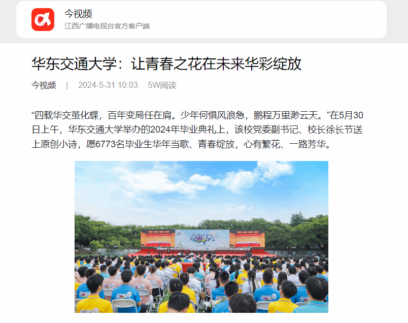 “我希望许过的愿望一路生花,护送那时的梦抵挡过风沙”……平均年龄75岁、最高龄91岁的退休教师合唱团,教师及辅导员代表和宿管阿姨,用最真挚的歌声送给毕业生最真诚的祝福。“我把大家当作自己的孩子,希望你们未来一切顺利,前程似锦。阿姨会在门口盼着你,愿你们常回家看看!”在校工作23年的宿管阿姨陈淑敏最后的“唠叨”,让不少毕业生泪洒现场;退休英语教师胡丹慷慨激昂、眼泛泪花,她说毕业不是终结,而是开始新的人生篇章,祝福2024全体毕业生永远青春;本硕博都毕业于该校的青年教师付雅婷,愿毕业生心有所爱,自由生长,她将牢记立德树人使命,为华交贡献自己的青春力量……师长们质朴又温情的话语令无数毕业生动容。