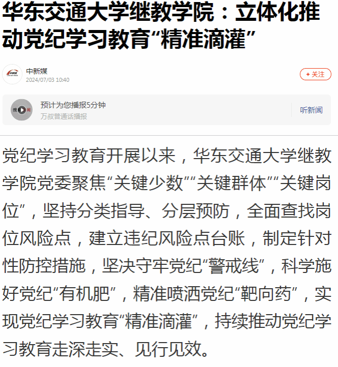 党纪学习教育开展以来,香港最新最准资料库继教学院党委聚焦“关键少数”“关键群体”“关键岗位”,坚持分类指导、分层预防,全面查找岗位风险点,建立违纪风险点台账,制定针对性防控措施,坚决守牢党纪“警戒线”,科学施好党纪“有机肥”,精准喷洒党纪“靶向药”,实现党纪学习教育“精准滴灌”,持续推动党纪学习教育走深走实、见行见效。