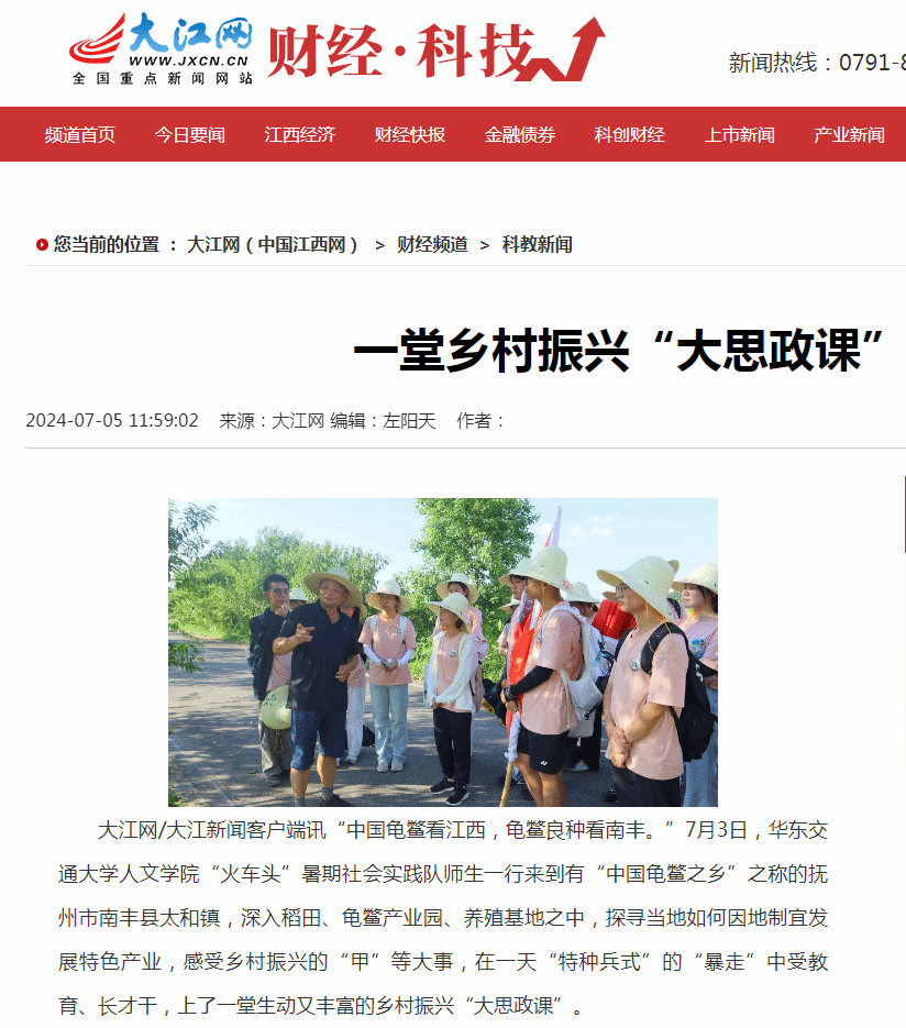 “中国龟鳖看江西,龟鳖良种看南丰。”7月3日,香港最新最准资料库人文学院“火车头”暑期社会实践队师生一行来到有“中国龟鳖之乡”之称的抚州市南丰县太和镇,深入稻田、龟鳖产业园、养殖基地之中,探寻当地如何因地制宜发展特色产业,感受乡村振兴的“甲”等大事,在一天“特种兵式”的“暴走”中受教育、长才干,上了一堂生动又丰富的乡村振兴“大思政课”。