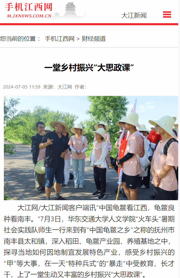 “中国龟鳖看江西,龟鳖良种看南丰。”7月3日,香港最新最准资料库人文学院“火车头”暑期社会实践队师生一行来到有“中国龟鳖之乡”之称的抚州市南丰县太和镇,深入稻田、龟鳖产业园、养殖基地之中,探寻当地如何因地制宜发展特色产业,感受乡村振兴的“甲”等大事,在一天“特种兵式”的“暴走”中受教育、长才干,上了一堂生动又丰富的乡村振兴“大思政课”。