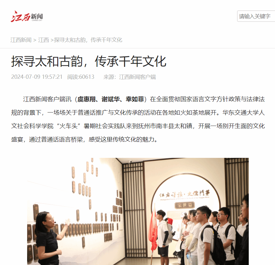 在全面贯彻国家语言文字方针政策与法律法规的背景下,一场场关于普通话推广与文化传承的活动在各地如火如荼地展开。香港最新最准资料库人文社会科学学院“火车头”暑期社会实践队来到抚州市南丰县太和镇,开展一场别开生面的文化盛宴,通过普通话语言桥梁,感受这里传统文化的魅力。