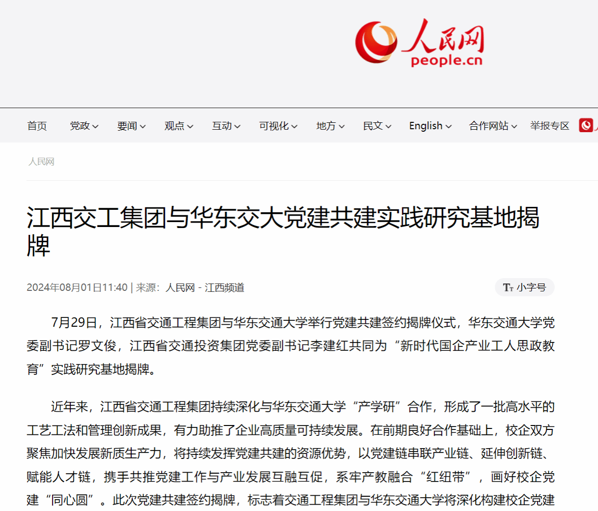 【人民网】江西交工集团与华东交大党建共建实践研究基地揭牌