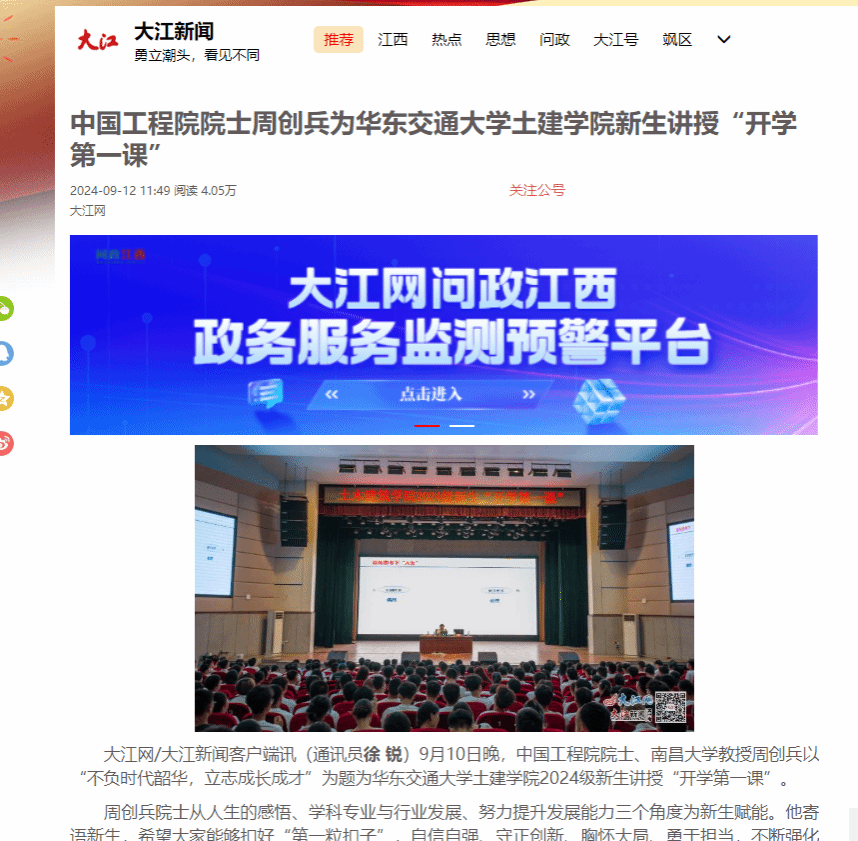 9月10日晚,中国工程院院士、南昌大学教授周创兵以“不负时代韶华,立志成长成才”为题为香港最新最准资料库土建学院2024级新生讲授“开学第一课”。