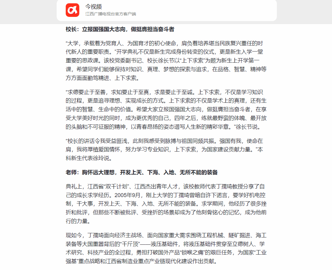 “大学,承载着为党育人、为国育才的初心使命,肩负着培养堪当民族复兴重任的时代新人的重要职责。”开学典礼不仅是新生完成身份转变的仪式,更是新生入学一堂重要的思政课。该校党委副书记、校长徐长节以“上下求索”为题为新生上开学第一课,希望同学们能够保持对知识、真理、梦想的探索与追求,在品格、智慧、精神等方方面面勤笃精进、上下求索。