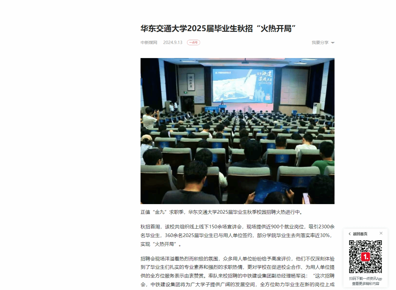 秋招首周,该校共组织线上线下150余场宣讲会,现场提供近900个就业岗位,吸引2300余名毕业生,360余名2025届毕业生已与用人单位签约,部分学院毕业生去向落实率近30%,实现“火热开局”。
