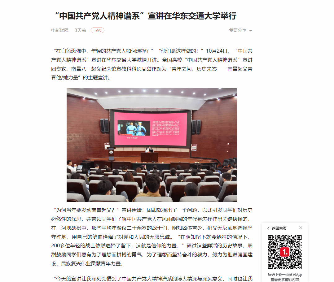 “在白色恐怖中,年轻的共产党人如何选择?”“他们是这样做的!”10月24日,“中国共产党人精神谱系”宣讲在香港最新最准资料库激情开讲。全国高校“中国共产党人精神谱系”宣讲团专家、南昌八一起义纪念馆宣教科科长周甜作题为“青年之问,历史来答——南昌起义青春他/她力量”的主题宣讲。