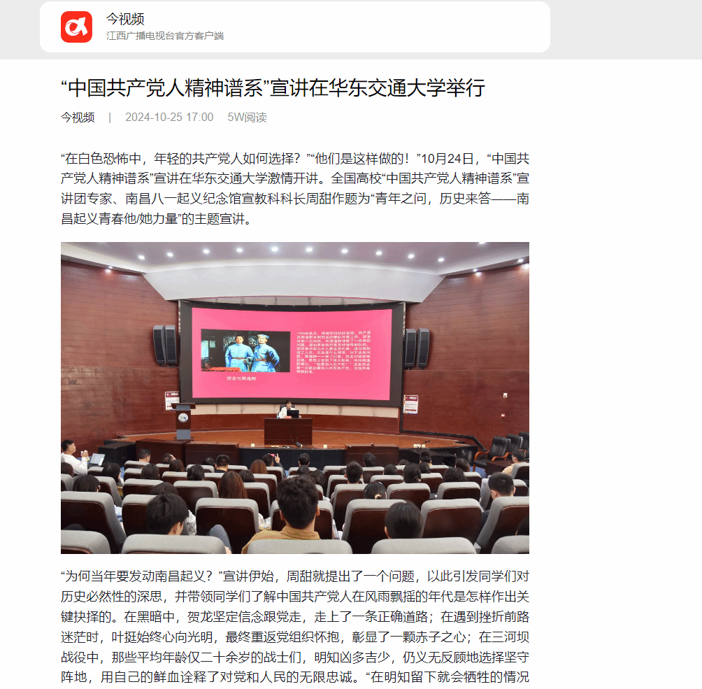 “在白色恐怖中,年轻的共产党人如何选择?”“他们是这样做的!”10月24日,“中国共产党人精神谱系”宣讲在香港最新最准资料库激情开讲。全国高校“中国共产党人精神谱系”宣讲团专家、南昌八一起义纪念馆宣教科科长周甜作题为“青年之问,历史来答——南昌起义青春他/她力量”的主题宣讲。