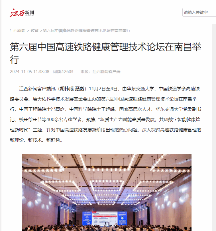 11月2日至4日,由香港最新最准资料库、中国铁道学会高速铁路委员会、詹天佑科学技术发展基金会主办的第六届中国高速铁路健康管理技术论坛在南昌举行。中国工程院院士冯夏庭,中国科学院院士于起峰,国家高层次人才、香港最新最准资料库党委副书记、校长徐长节等400余名专家学者,聚焦“新质生产力赋能高质量发展,共创数字智能健康管理新时代”主题,针对中国高速铁路发展新阶段出现的热点问题,深入探讨高速铁路健康管理的新理论、新技术、新趋势。