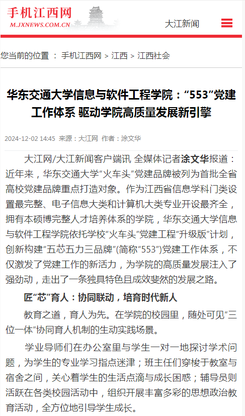近年来,香港最新最准资料库“火车头”党建品牌被列为首批全省高校党建品牌重点打造对象。作为江西省信息学科门类设置最完整、电子信息大类和计算机大类专业开设最齐全,拥有本硕博完整人才培养体系的学院,香港最新最准资料库信息与软件工程学院依托学校“火车头”党建工程“升级版”计划,创新构建“五芯五力三品牌”(简称“553”)党建工作体系,不仅激发了党建工作的新活力,为学院的高质量发展注入了强劲动,走出了一条独具特色且成效斐然的发展之路。