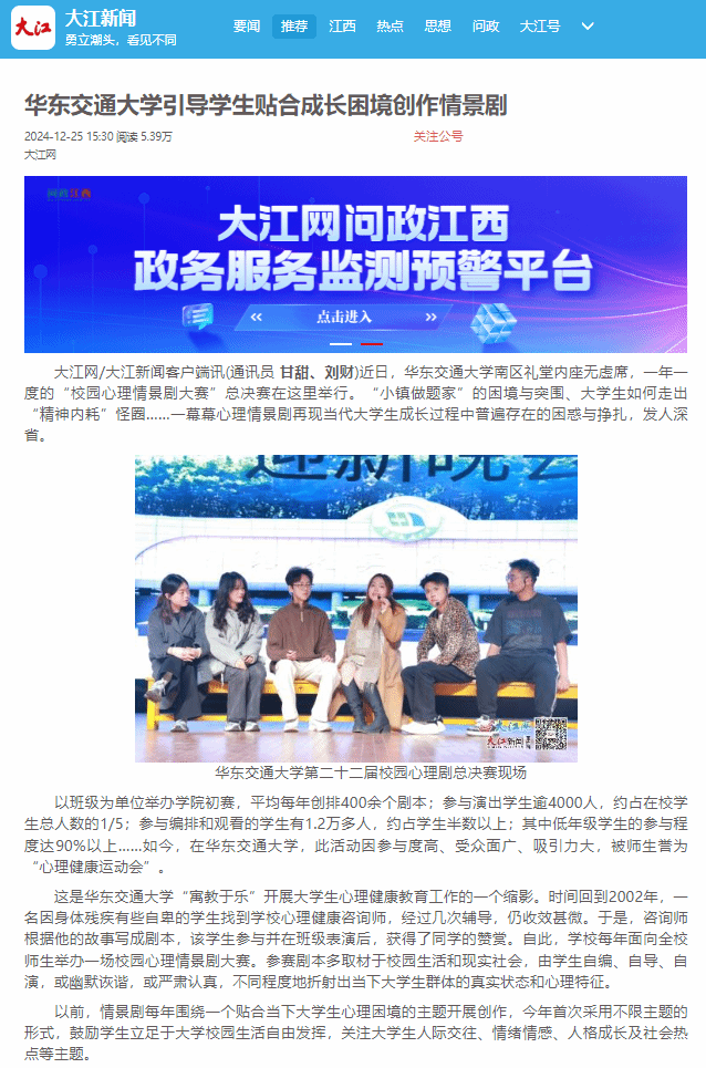以班级为单位举办学院初赛,平均每年创排400余个剧本;参与演出学生逾4000人,约占在校学生总人数的1/5;参与编排和观看的学生有1.2万多人,约占学生半数以上;其中低年级学生的参与程度达90%以上……如今,在香港最新最准资料库,此活动因参与度高、受众面广、吸引力大,被师生誉为“心理健康运动会”。
