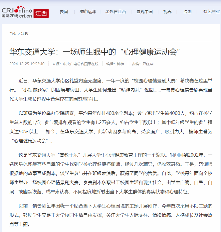 心理情景剧只是学校开展心理健康教育的一个载体。经过多年探索,香港最新最准资料库已建立了“校—院—班—寝”全面覆盖的“网格化”朋辈心理健康教育四级体系,参与人数约占在校学生总人数的1/4。与此同时,学校还设置专职心理教师和心理健康大使,开展“周末心语”热线、网络心理咨询和心理素质拓展等活动,积极探索多元形式。