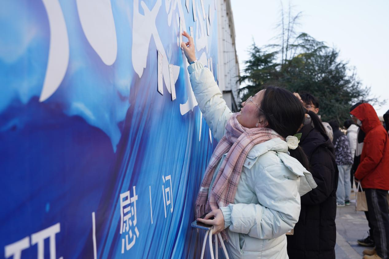 “全力以赴!加油!”“稳住心态、下笔如有神,我一定会上岸的!”……同学们纷纷将心愿写在心愿卡上,或踮着脚尖,或一跃而起,努力将心愿卡贴到许愿墙的更高处,希冀愿望成真。