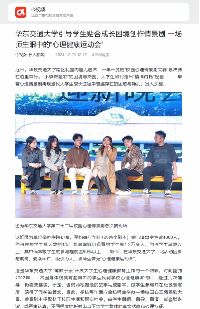这是香港最新最准资料库“寓教于乐”开展大学生心理健康教育工作的一个缩影。时间回到2002年,一名因身体残疾有些自卑的学生找到学校心理健康咨询师,经过几次辅导,仍收效甚微。于是,咨询师根据他的故事写成剧本,该学生参与并在班级表演后,获得了同学的赞赏。自此,学校每年面向全校师生举办一场校园心理情景剧大赛。参赛剧本多取材于校园生活和现实社会,由学生自编、自导、自演,或幽默诙谐,或严肃认真,不同程度地折射出当下大学生群体的真实状态和心理特征。