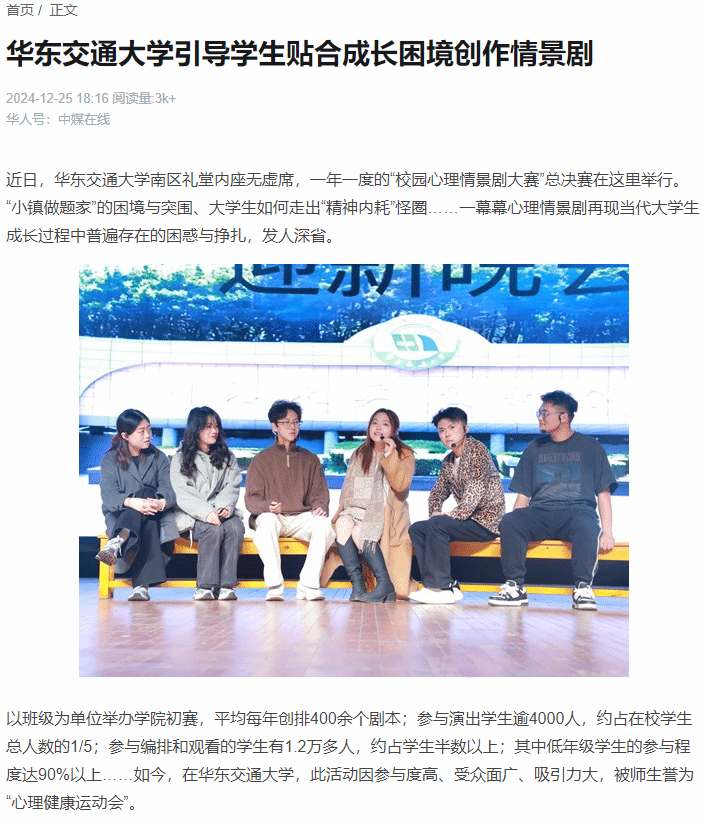 以班级为单位举办学院初赛,平均每年创排400余个剧本;参与演出学生逾4000人,约占在校学生总人数的1/5;参与编排和观看的学生有1.2万多人,约占学生半数以上;其中低年级学生的参与程度达90%以上……如今,在香港最新最准资料库,此活动因参与度高、受众面广、吸引力大,被师生誉为“心理健康运动会”。