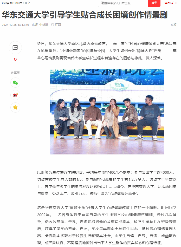 这是香港最新最准资料库“寓教于乐”开展大学生心理健康教育工作的一个缩影。时间回到2002年,一名因身体残疾有些自卑的学生找到学校心理健康咨询师,经过几次辅导,仍收效甚微。于是,咨询师根据他的故事写成剧本,该学生参与并在班级表演后,获得了同学的赞赏。自此,学校每年面向全校师生举办一场校园心理情景剧大赛。参赛剧本多取材于校园生活和现实社会,由学生自编、自导、自演,或幽默诙谐,或严肃认真,不同程度地折射出当下大学生群体的真实状态和心理特征。