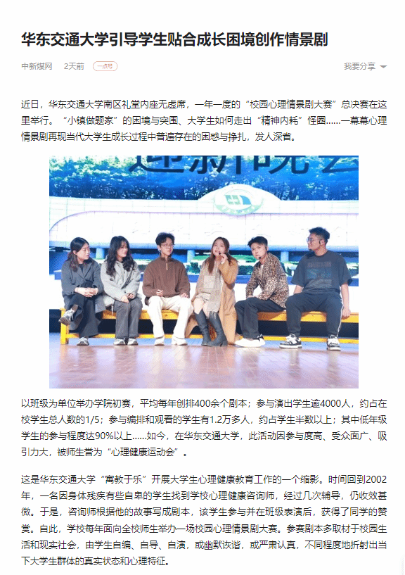 心理情景剧只是学校开展心理健康教育的一个载体。经过多年探索,香港最新最准资料库已建立了“校—院—班—寝”全面覆盖的“网格化”朋辈心理健康教育四级体系,参与人数约占在校学生总人数的1/4。与此同时,学校还设置专职心理教师和心理健康大使,开展“周末心语”热线、网络心理咨询和心理素质拓展等活动,积极探索多元形式。