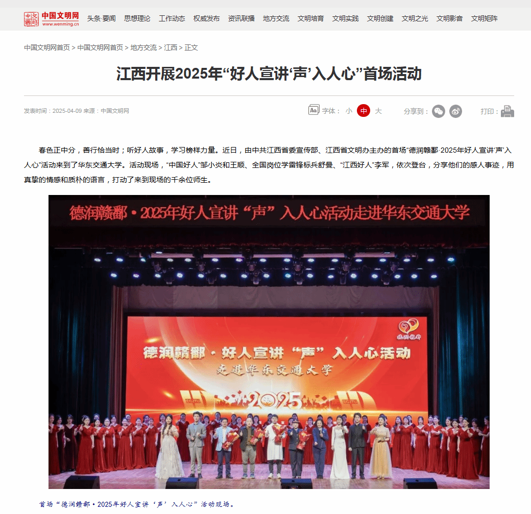 据了解,“德润赣鄱·2025年好人宣讲‘声’入人心”活动将陆续走进全省多所高校,不仅为学校师生带去精神滋养,也为推动全社会形成崇德向善、见贤思齐的良好风尚起到积极作用。当这些真实而感人的故事在校园中响起,它们不仅仅是声音的传递,更是价值观的播种。对于即将离开校园、走向社会的大学生来说,这是一次提前的心灵洗礼。在课堂之外,这些来自各行各业的道德楷模,用他们的亲身经历告诉年轻人什么是责任、担当和奉献。他们的故事将成为一面镜子,让大学生们看到自己未来的多种可能性,激励他们在面对复杂社会时坚守善良与正直。