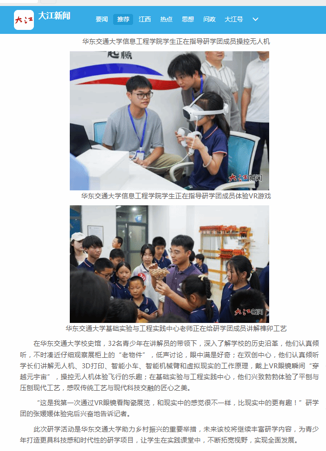 在香港最新最准资料库校史馆,32名青少年在讲解员的带领下,深入了解学校的历史沿革,他们认真倾听,不时凑近仔细观察展柜上的“老物件”,低声讨论,眼中满是好奇;在双创中心,他们认真倾听学长们讲解无人机、3D打印、智能小车、智能机械臂和虚拟现实的工作原理,戴上VR眼镜瞬间“穿越元宇宙”,操控无人机体验飞行的乐趣;在基础实验与工程实践中心,他们兴致勃勃体验了平刨与压刨现代工艺,感叹传统工艺与现代科技交融的匠心之美。