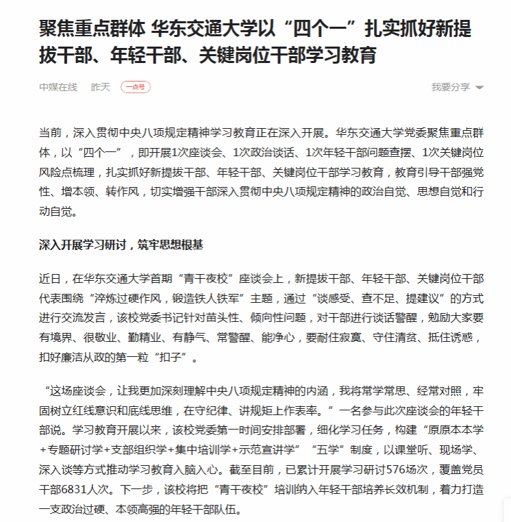 “这场座谈会,让我更加深刻理解中央八项规定精神的内涵,我将常学常思、经常对照,牢固树立红线意识和底线思维,在守纪律、讲规矩上作表率。”一名参与此次座谈会的年轻干部说。学习教育开展以来,该校党委第一时间安排部署,细化学习任务,构建“原原本本学+专题研讨学+支部组织学+集中培训学+示范宣讲学”“五学”制度,以课堂听、现场学、深入谈等方式推动学习教育入脑入心。截至目前,已累计开展学习研讨576场次,覆盖党员干部6831人次。下一步,该校将把“青干夜校”培训纳入年轻干部培养长效机制,着力打造一支政治过硬、本领高强的年轻干部队伍。