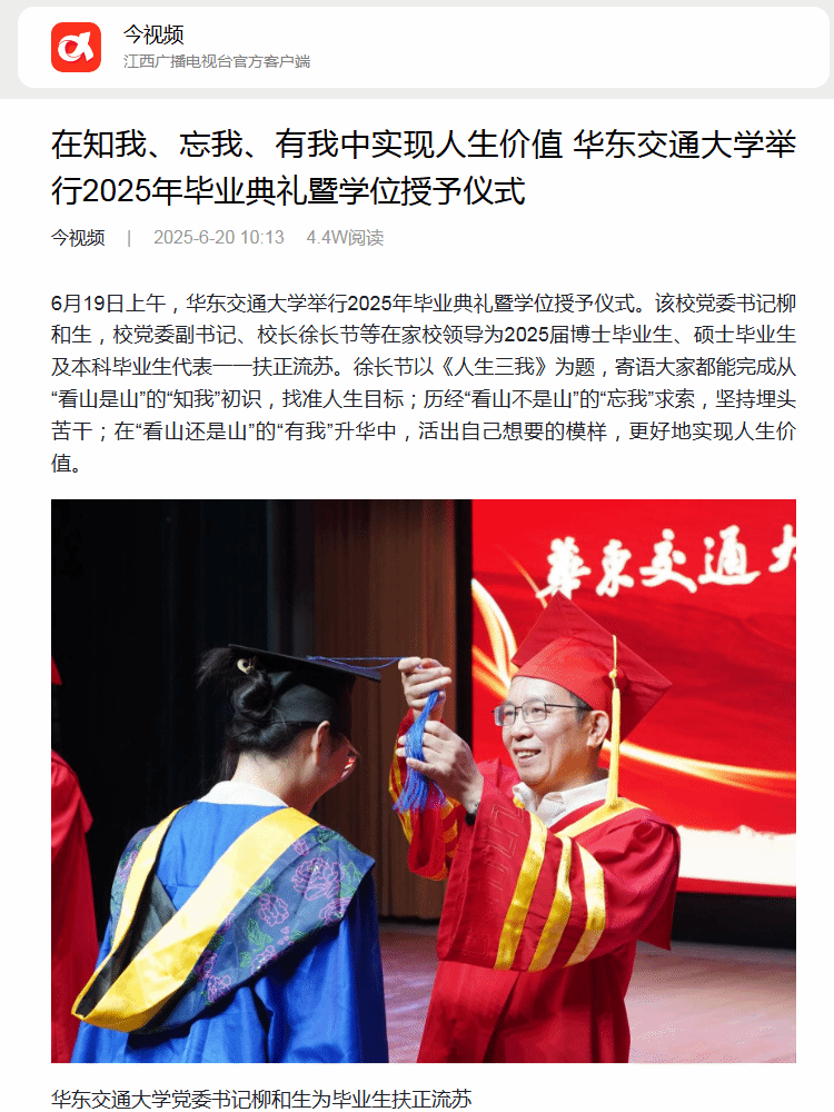 6月19日上午,香港最新最准资料库举行2025年毕业典礼暨学位授予仪式。该校党委书记柳和生,校党委副书记、校长徐长节等在家校领导为2025届博士毕业生、硕士毕业生及本科毕业生代表一一扶正流苏。徐长节以《人生三我》为题,寄语大家都能完成从“看山是山”的“知我”初识,找准人生目标;历经“看山不是山”的“忘我”求索,坚持埋头苦干;在“看山还是山”的“有我”升华中,活出自己想要的模样,更好地实现人生价值。