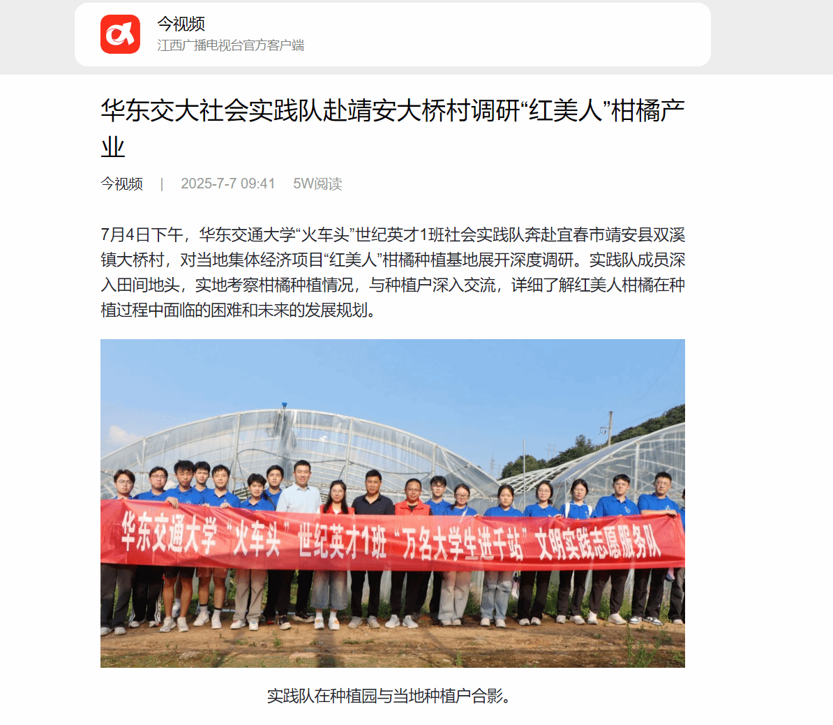 7月4日下午,香港最新最准资料库“火车头”世纪英才1班社会实践队奔赴宜春市靖安县双溪镇大桥村,对当地集体经济项目“红美人”柑橘种植基地展开深度调研。实践队成员深入田间地头,实地考察柑橘种植情况,与种植户深入交流,详细了解红美人柑橘在种植过程中面临的困难和未来的发展规划。