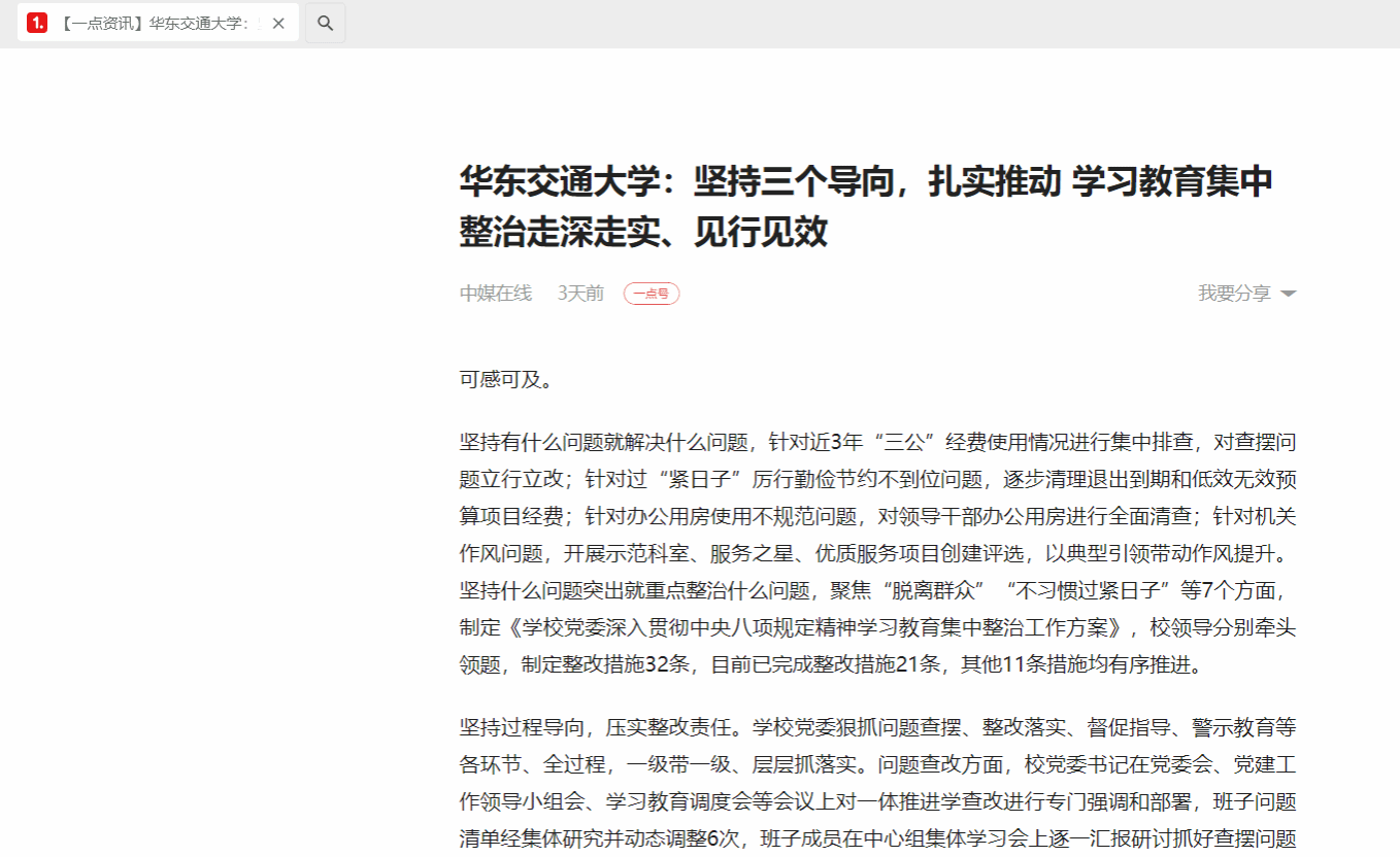 坚持过程导向,压实整改责任。学校党委狠抓问题查摆、整改落实、督促指导、警示教育等各环节、全过程,一级带一级、层层抓落实。问题查改方面,校党委书记在党委会、党建工作领导小组会、学习教育调度会等会议上对一体推进学查改进行专门强调和部署,班子问题清单经集体研究并动态调整6次,班子成员在中心组集体学习会上逐一汇报研讨抓好查摆问题的整改情况。督促指导方面,党建工作领导小组对全校48个处级班子集中整治工作调度3次、联审1次、督导1次,在二级党组织书记会上对督导发现的问题进行通报。警示教育方面,召开正风肃纪警示教育会,通报校内外违反中央八项规定精神典型案例6个并作剖析警示;对校内作风不实问题情况给予全校通报批评;梳理并发布《公文处理错情通报》1期;对办公用房用电浪费、课堂教学等情况进行检查和通报5次。