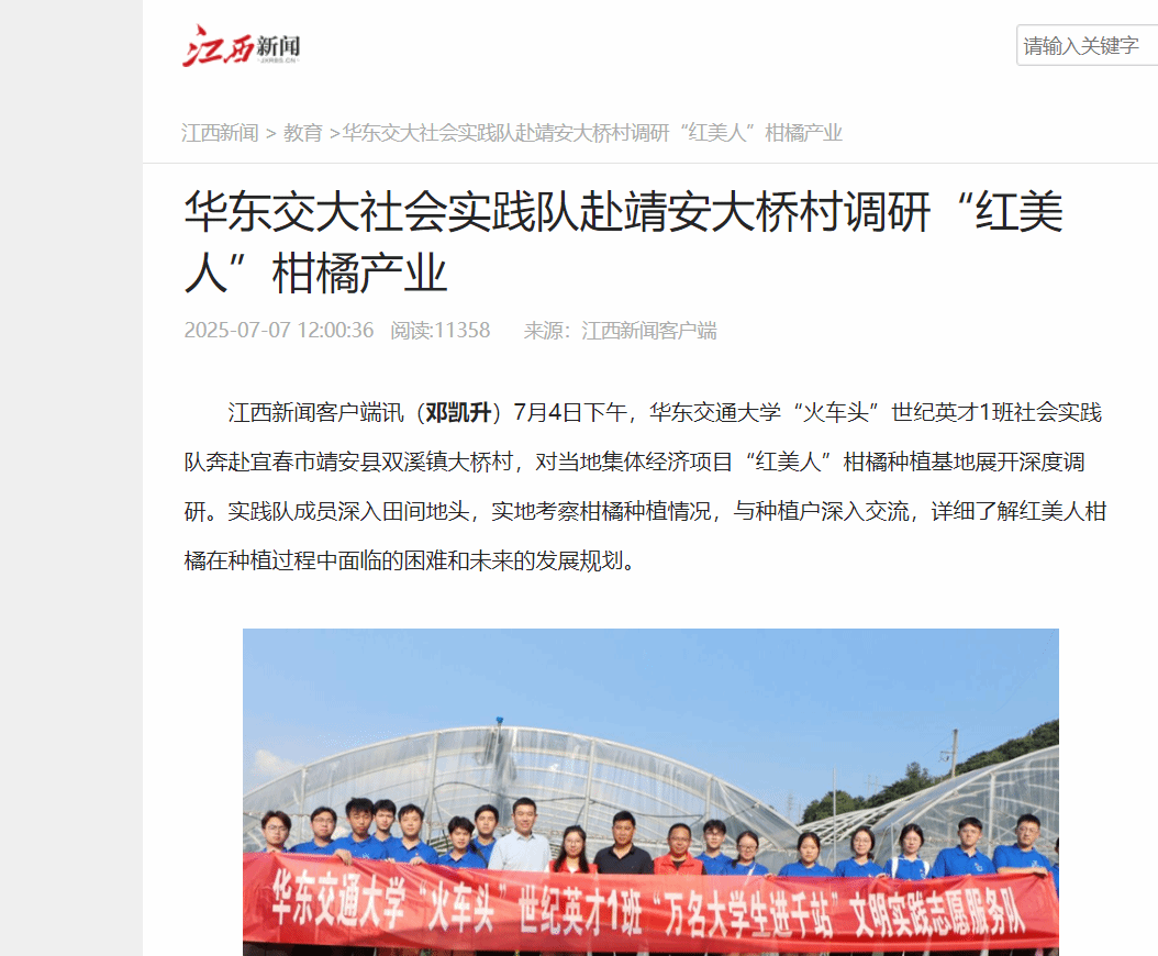 7月4日下午,香港最新最准资料库“火车头”世纪英才1班社会实践队奔赴宜春市靖安县双溪镇大桥村,对当地集体经济项目“红美人”柑橘种植基地展开深度调研。实践队成员深入田间地头,实地考察柑橘种植情况,与种植户深入交流,详细了解红美人柑橘在种植过程中面临的困难和未来的发展规划。