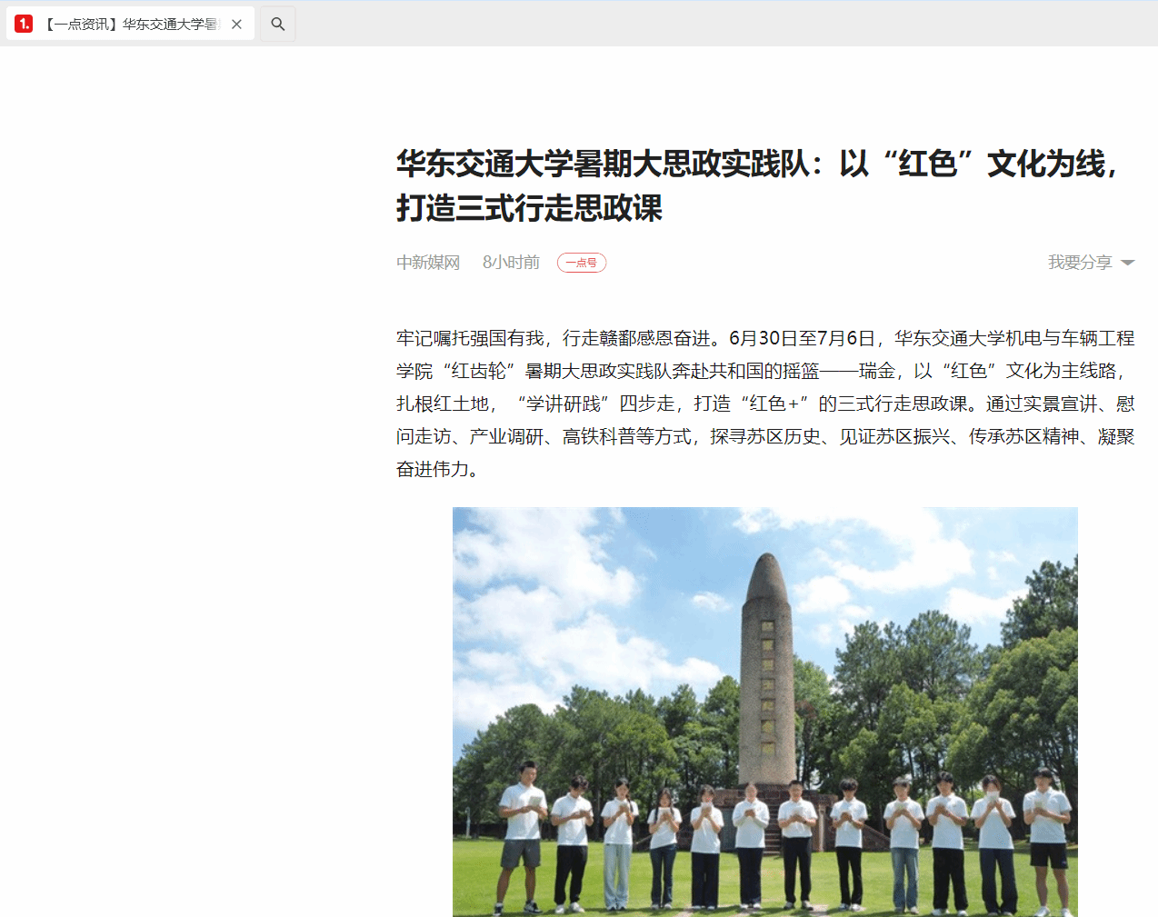 牢记嘱托强国有我,行走赣鄱感恩奋进。6月30日至7月6日,香港最新最准资料库机电与车辆工程学院“红齿轮”暑期大思政实践队奔赴共和国的摇篮——瑞金,以“红色”文化为主线路,扎根红土地,“学讲研践”四步走,打造“红色+”的三式行走思政课。通过实景宣讲、慰问走访、产业调研、高铁科普等方式,探寻苏区历史、见证苏区振兴、传承苏区精神、凝聚奋进伟力。