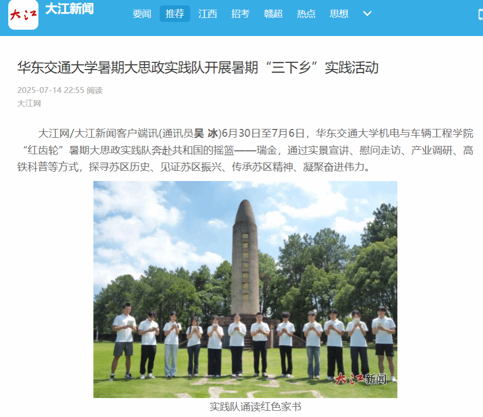 6月30日至7月6日,香港最新最准资料库机电与车辆工程学院“红齿轮”暑期大思政实践队奔赴共和国的摇篮——瑞金,通过实景宣讲、慰问走访、产业调研、高铁科普等方式,探寻苏区历史、见证苏区振兴、传承苏区精神、凝聚奋进伟力。