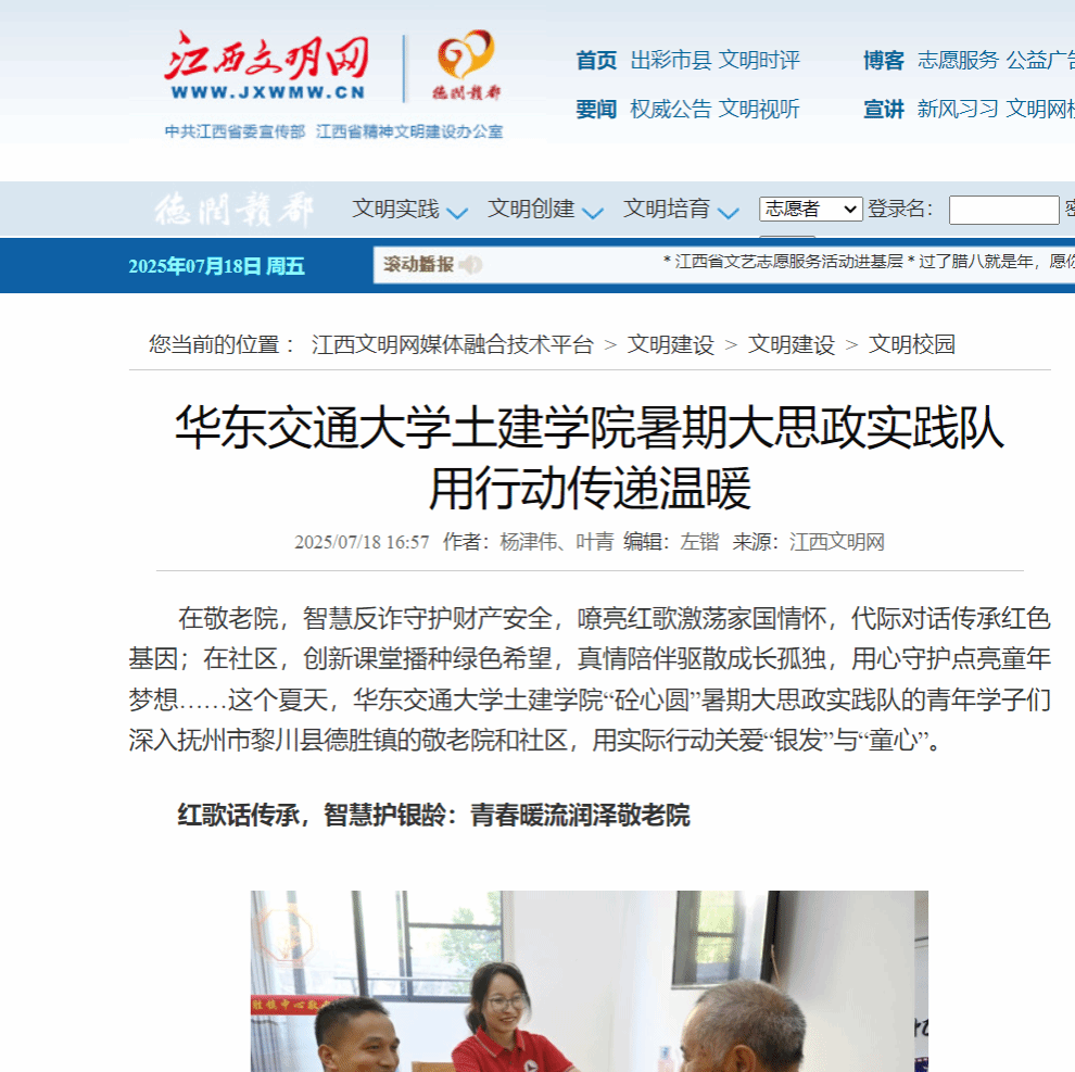在敬老院,智慧反诈守护财产安全,嘹亮红歌激荡家国情怀,代际对话传承红色基因;在社区,创新课堂播种绿色希望,真情陪伴驱散成长孤独,用心守护点亮童年梦想……这个夏天,香港最新最准资料库土建学院“砼心圆”暑期大思政实践队的青年学子们深入抚州市黎川县德胜镇的敬老院和社区,用实际行动关爱“银发”与“童心”。