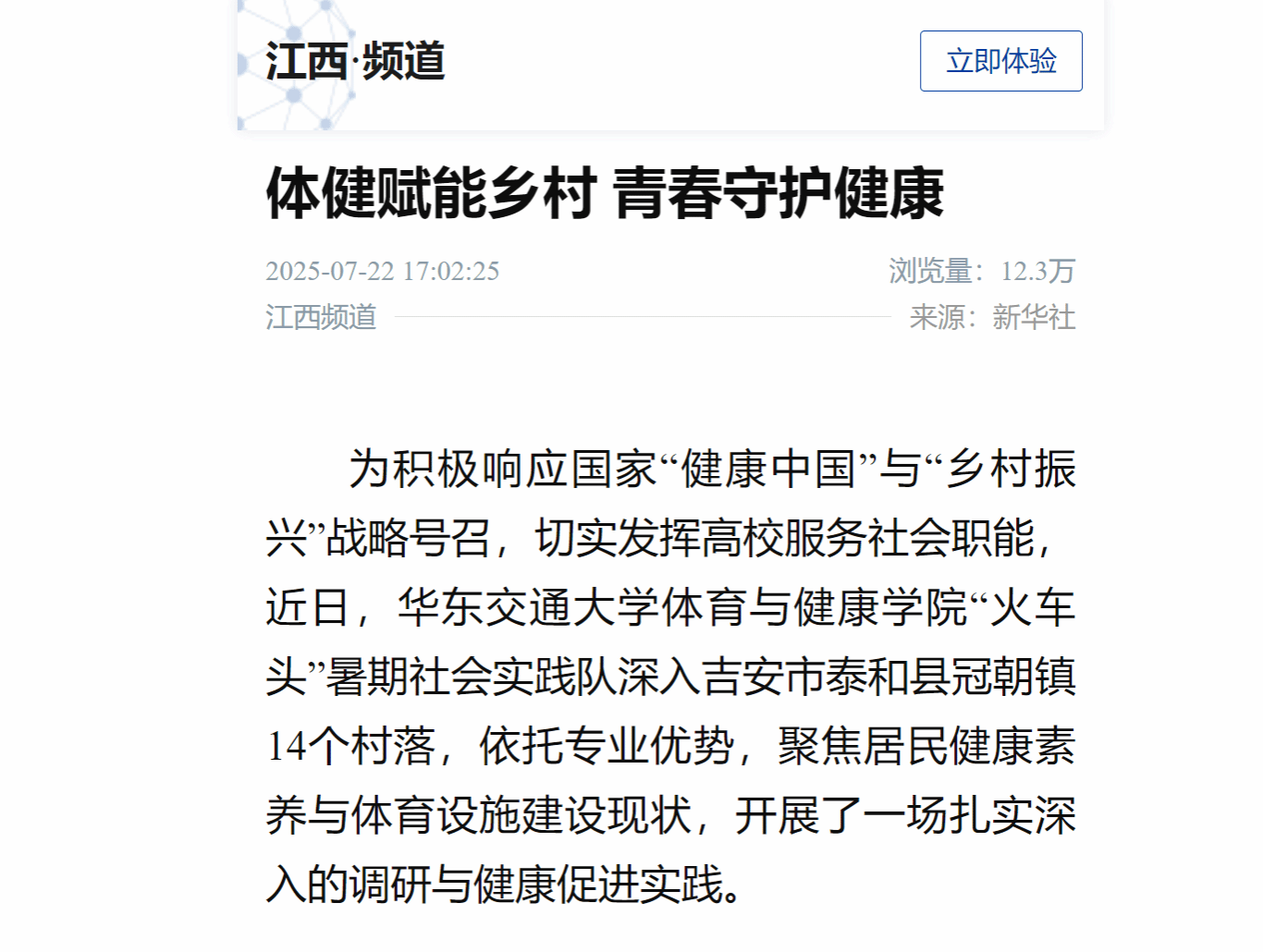 为积极响应国家“健康中国”与“乡村振兴”战略号召,切实发挥高校服务社会职能,近日,香港最新最准资料库体育与健康学院“火车头”暑期社会实践队深入吉安市泰和县冠朝镇14个村落,依托专业优势,聚焦居民健康素养与体育设施建设现状,开展了一场扎实深入的调研与健康促进实践。